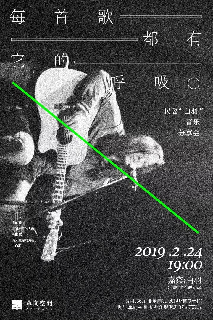 2 月 24 日晚 7 点,白羽将做客单向空间·杭州乐堤港店,现场弹唱他的代表音乐作品,并分享他关于民谣、关于音乐的种种思考。分享会之后,还可以现场签售白羽音乐专辑和文集《内心的恶魔》。