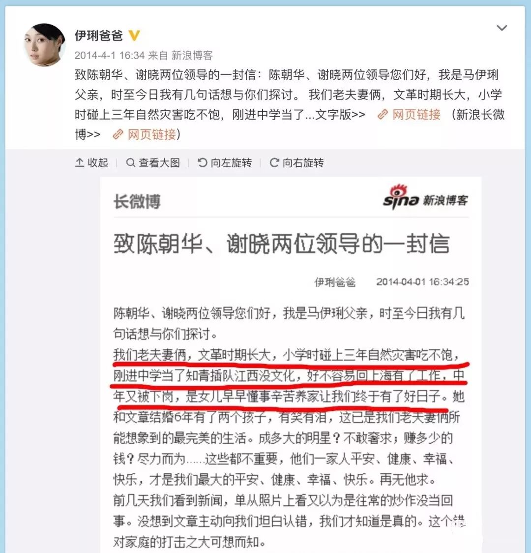 马伊琍爸爸在文章的事件时开过一个微博账号,官方认证了,发了一封信,其中还写到: