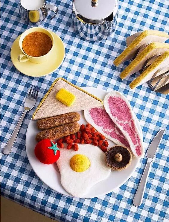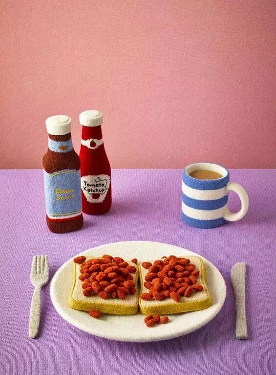 A full platter of English breakfast, beans on toasts, a hot dog covered with mustard. And if we need more condiments we can find them next to our cutlery, salt, pepper, ketchup; Jessica thought of everything. Using lambswool and a knitting machine, she fashioned all the foods at home. She says the bacon was the hardest to achieve as she wanted all the fat to be as real as possible.