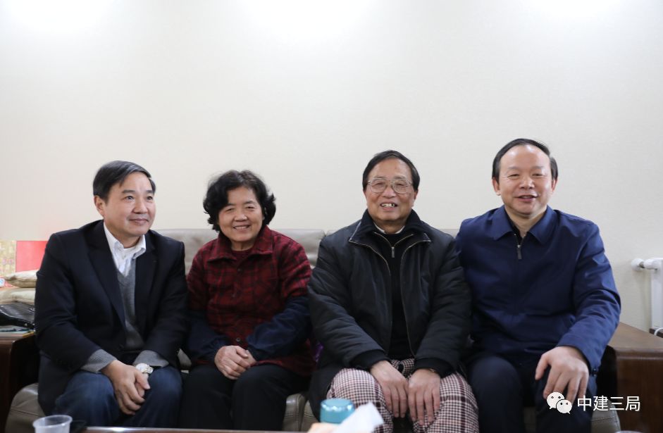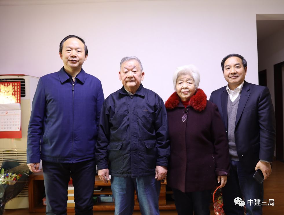 2月11日,中建三局董事长、党委书记陈华元,总经理易文权慰问局老领导洪可柱(右二)。(朱军伟)