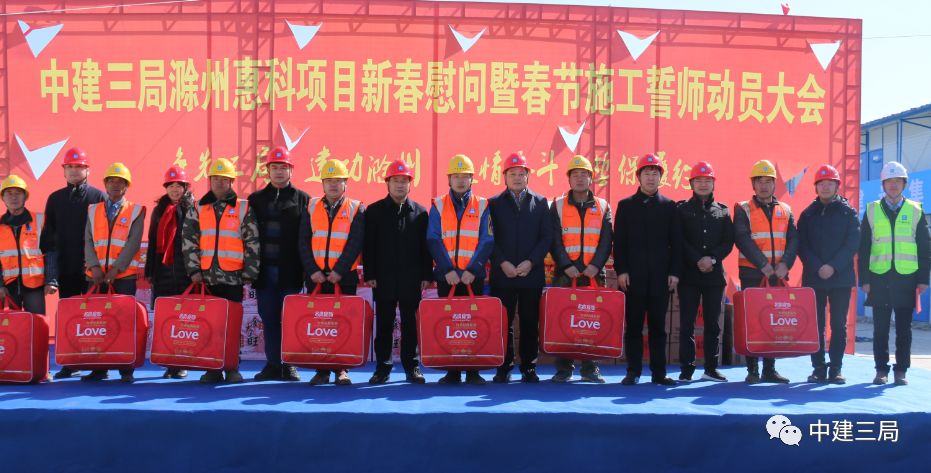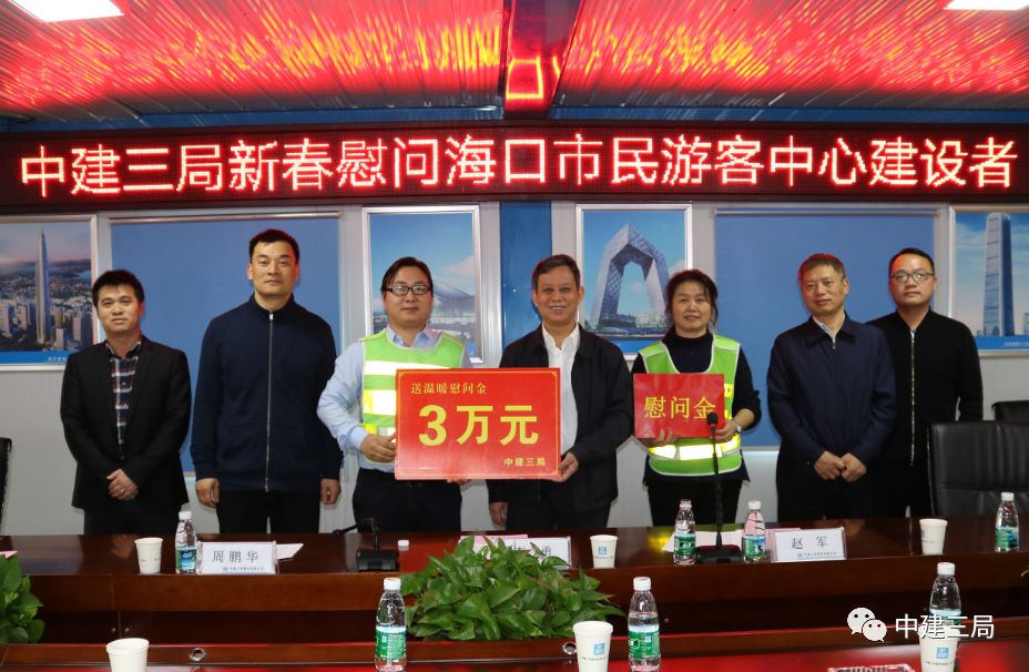 2月10日,中建三局副总经理李勇慰问总承包公司海口市民游客中心项目建设者。(苏厚芳 龚聪)
