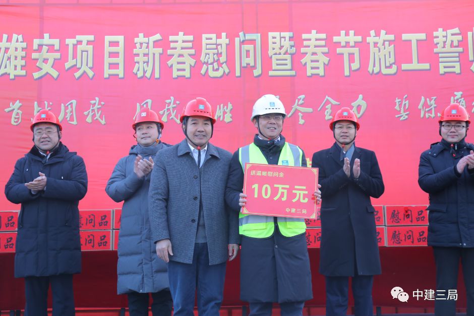 2月10日,中建三局总经理易文权慰问雄安市民服务中心项目建设者。(张伟豪 吕丽萍 黄鹏程)