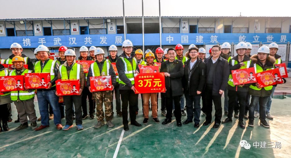 2月11日,中建三局党委副书记、工会主席胡金国慰问基础设施建设投资公司武汉黄家湖管廊项目建设者。(樊祥叙 明亮)
