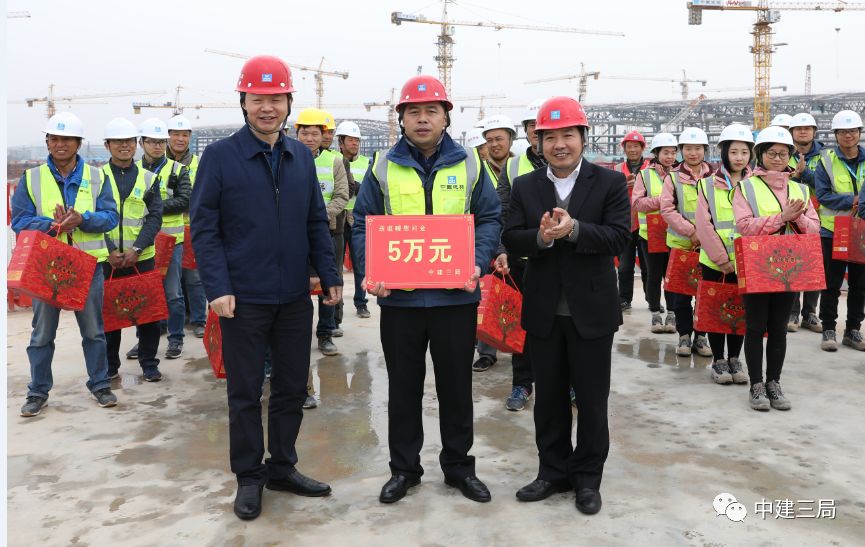 2月7日,中建三局董事长、党委书记陈华元,总经理易文权慰问二公司深圳国际会展中心项目建设者。(邓宜 黄书书)