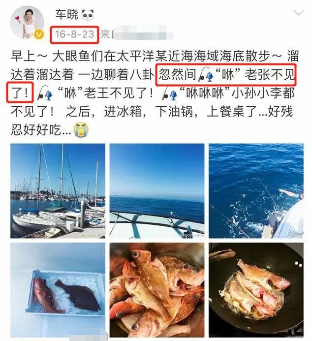 仔细翻阅车晓当时分享的照片,可以发现车晓看完演唱会的第二天有发一条打鱼的动态。动态里车晓将小鱼儿拟人化,其中一条还取名叫“老张”,语气十分可爱,不知道是不是在暗示什么呢?