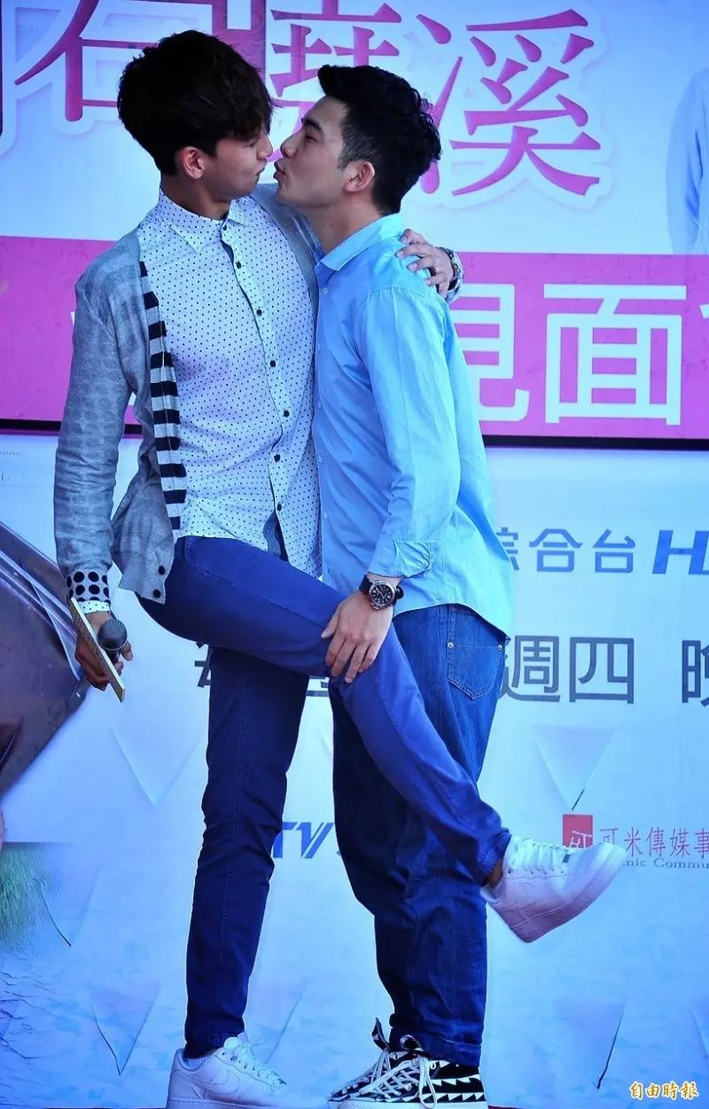 八大《明若曉溪》台北見面會;SpeXial Evan(左)、胡瑋杰(右)作勢親吻。(記者陳奕全攝)