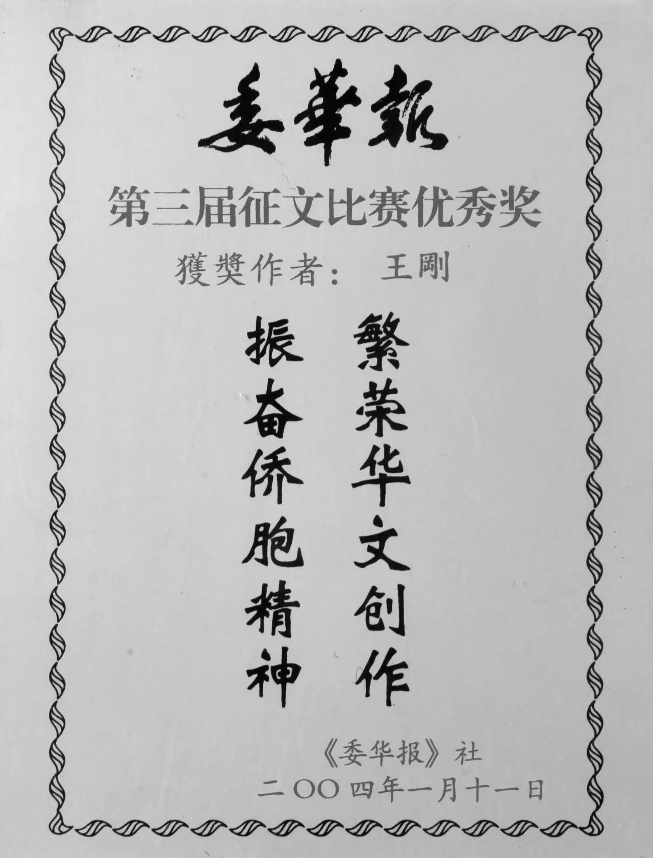2004年,王刚作品在《委华报》征文比赛中获奖