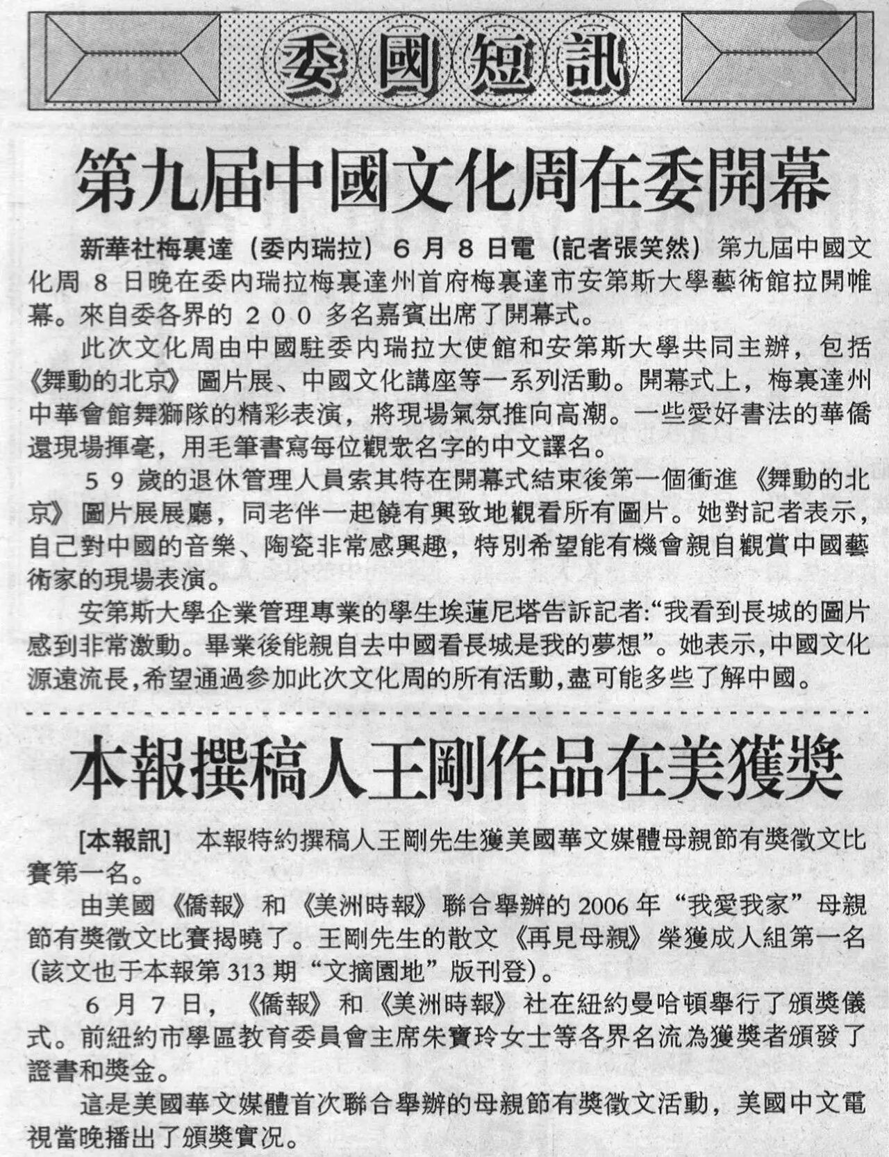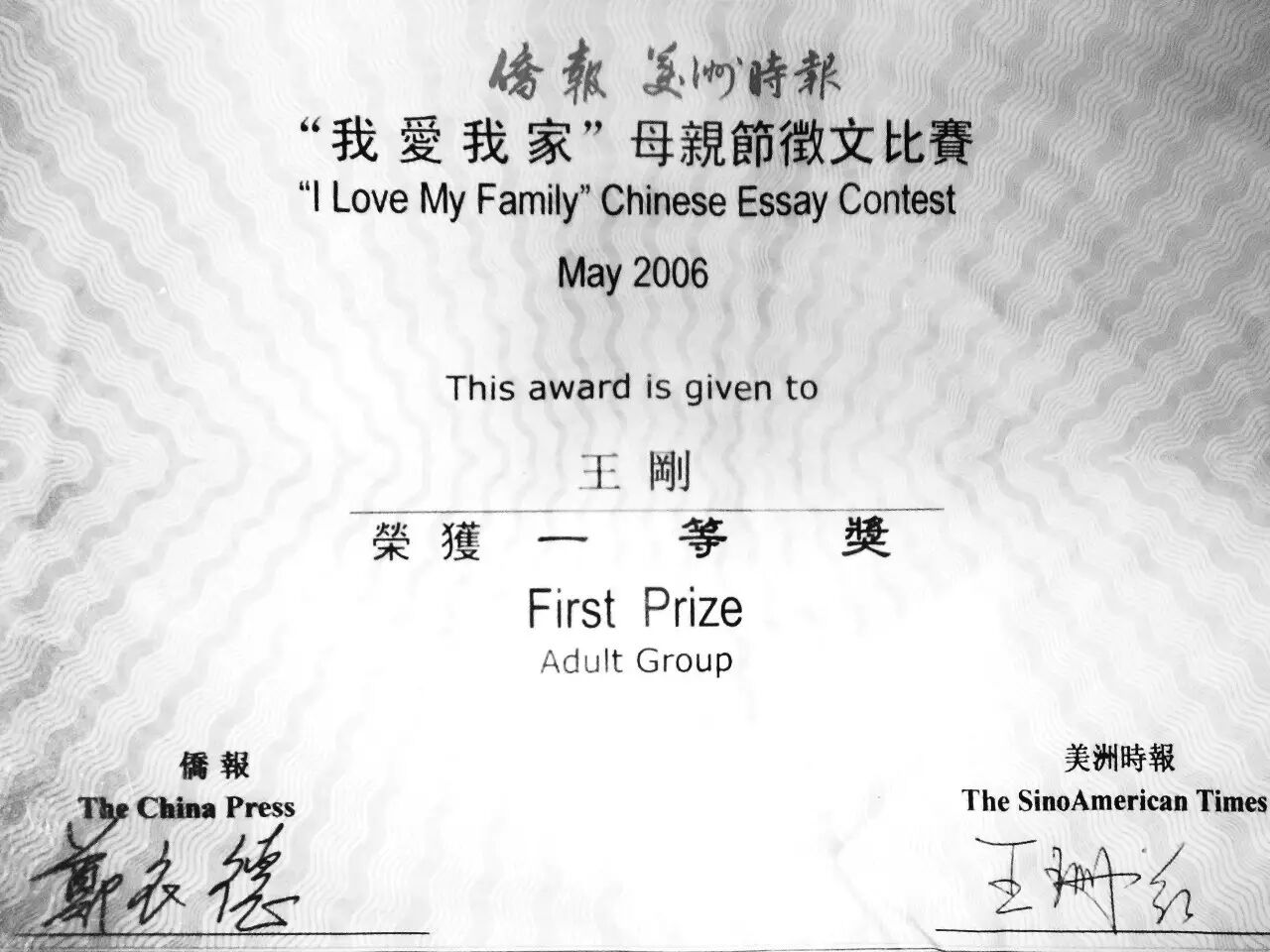 2006年,王刚的散文《再见母亲》获美国《侨报》《美洲时报》全球华人母亲节征文比赛一等奖