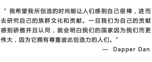 出生于美国纽约哈林区的 Dapper Dan 十分勤奋,从小车摆摊开始,到在纽约第125 街开了自己的高定精品店,以24小时无休的勤劳风格,来为客户进行定制化服务。以自己的方式强化了种族的特色与骄傲,以独特的创意,教会了那个世代的黑人如何与时尚打交道。他曾为不计其数的明星名人设计过充满嘻哈风格的服装与造型,他的设计之所以成为街头经典传奇,也在于他贩售的不仅仅是一件衣服,更是一种超脱与逃避。对于当时黑人无法在现实社会触及的经济地位和时尚品牌,从 Dapper Dan 的服装中找到另类的拥有方式。