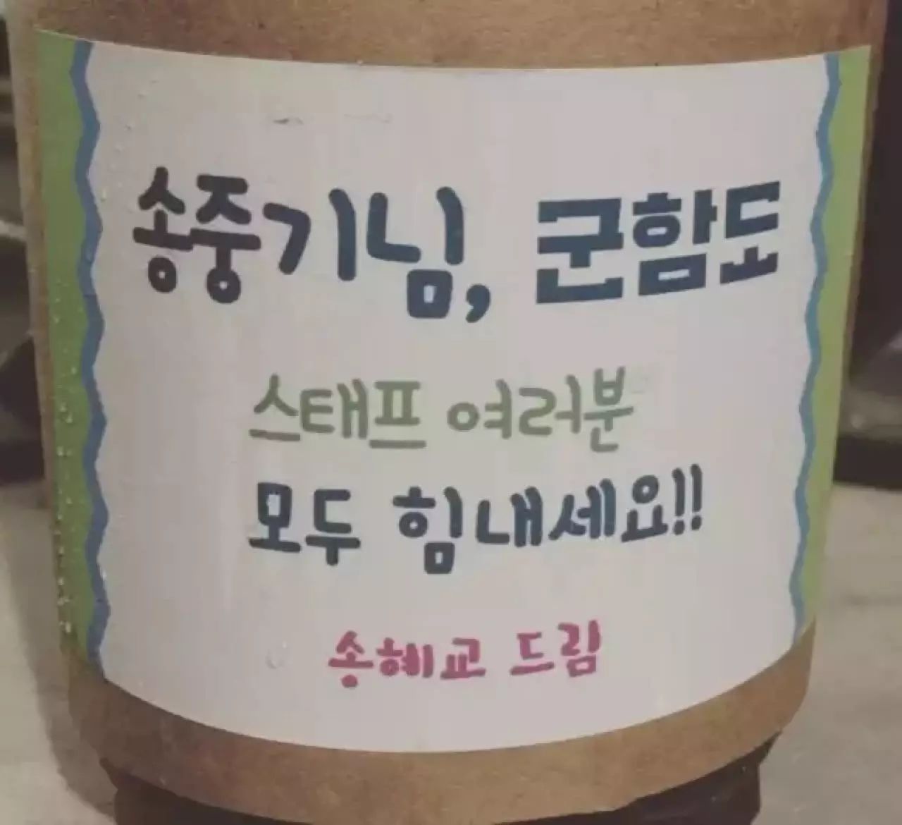 他拍摄电影《军舰岛》,她就给剧组送去了咖啡车,来为宋仲基应援。每杯咖啡上都写着:“宋仲基,《军舰岛》各位职员们加油!宋慧乔敬上!”