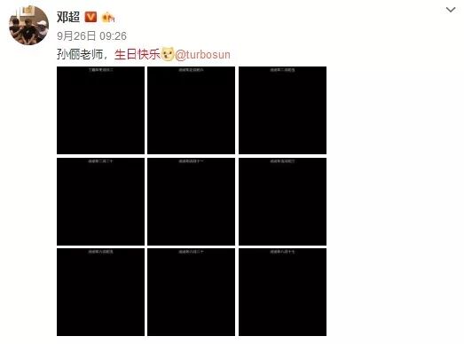 孙俪今年过36岁生日的时候,邓超在9点26分发了一组看似黑屏,其实特别有深意的生日祝福九宫格为孙俪庆生。