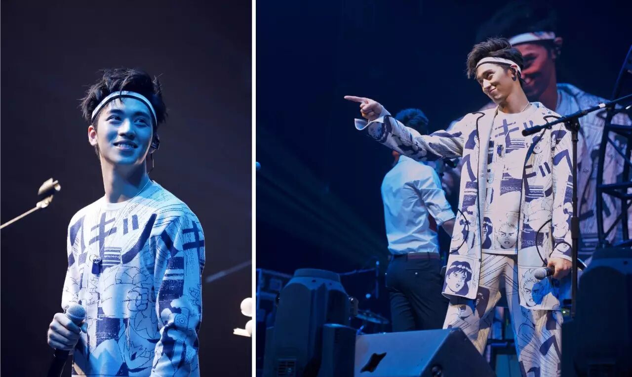 北京演唱会时LOEWE的漫画装饰上衣、外套、阔腿裤最是少年意气,头绑黑白发带,自己就像热血漫画里走出来的人物。