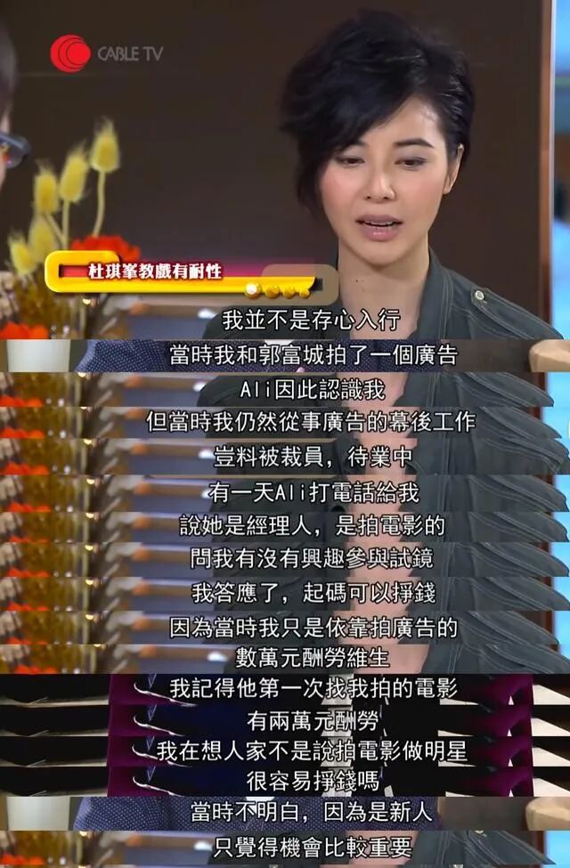 因为被裁员后,后来成为她经纪人的Ali就打电话找她,问她没有兴趣去参加电影试镜,正愁没工作没收入的她欣然应下,她还清楚记得自己拍的第一部电影拿到了两万块钱的酬劳,跟她在广告公司的月薪差不多。