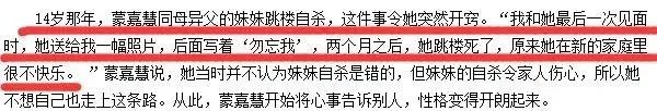 最让人没想到的是,蒙嘉慧妈妈和继父离婚后,她的妹妹跟着亲生父亲生活,结果继母对她不好,她妹妹想不开跳楼自杀了,这件事对她的影响很大。