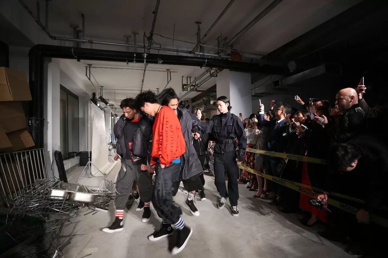 在秀的最后,模特们走到了监狱的背景板前,像囚犯一样拍摄正面、侧面的照片,甚至在秀场上表演起了“打群架”和“警察追捕”的桥段,非常戏剧化,气氛超级热烈。
