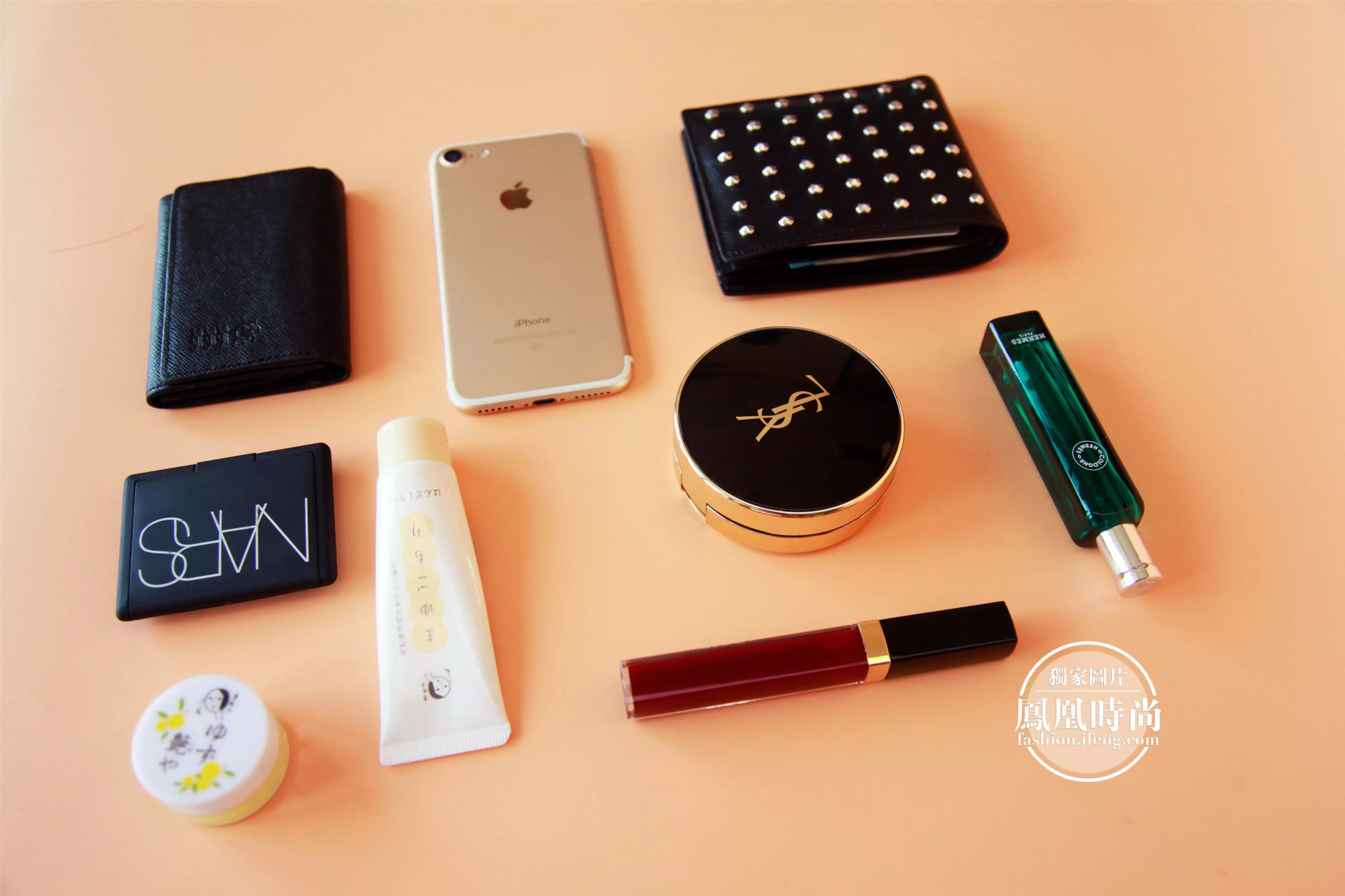 包包只有一个大口袋,把上图中的粉底盒、手机钱包等东西装进去后正好可以轻松盖上包盖~~