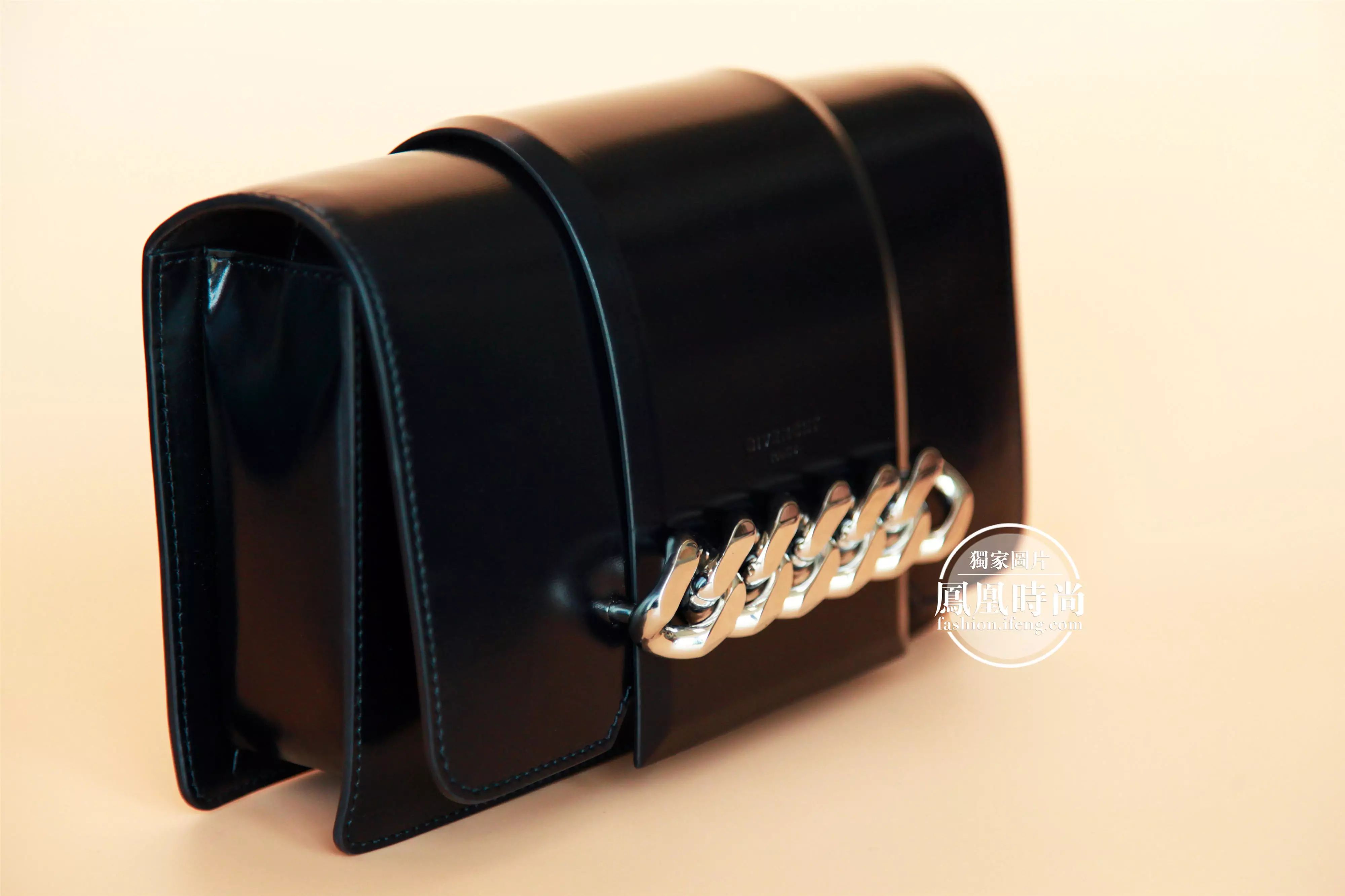 包包整体呈方方正正的长方形,正中间装饰一条宽皮带和粗犷Infinity金属链,非常帅气豪放~~~