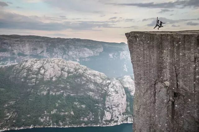 他们一起爬上挪威的布道石的顶端,享受这个奇妙的冒险之旅。