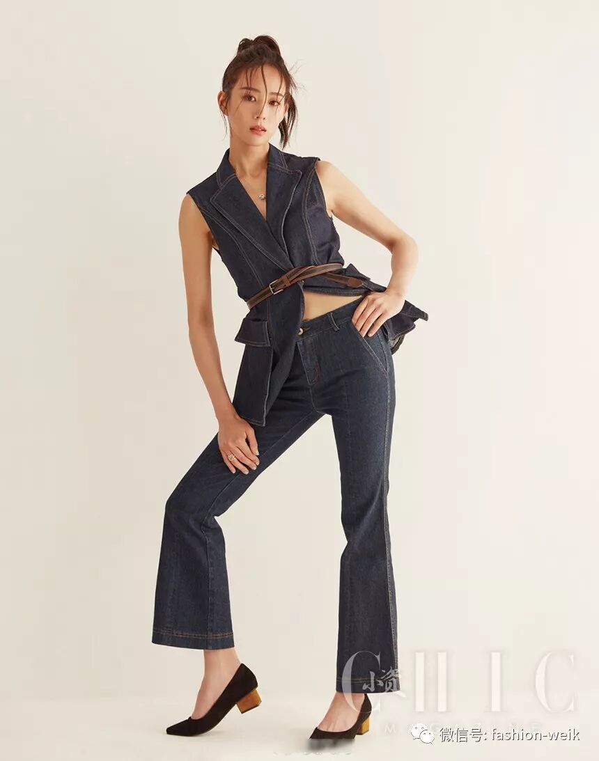 张钧甯对于V领也是情有独钟,在一袭杂志的大片中,一件无袖的牛仔上衣,下搭牛仔裤,扎上腰带,扎起辫子。性感之中带着几分酷酷的,潇洒洒脱的范儿,时尚的表现力丝毫不比职业模特差。