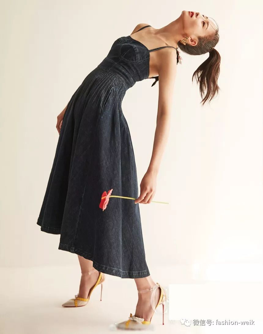 除了小深V,背带款也是张钧甯最近拍大片常见的款式,一件牛仔背带裙,配上黄色的高跟鞋,扎上高高的马尾辫。再以红唇,与耳环点缀,造型抢眼而又有艺术的气息。