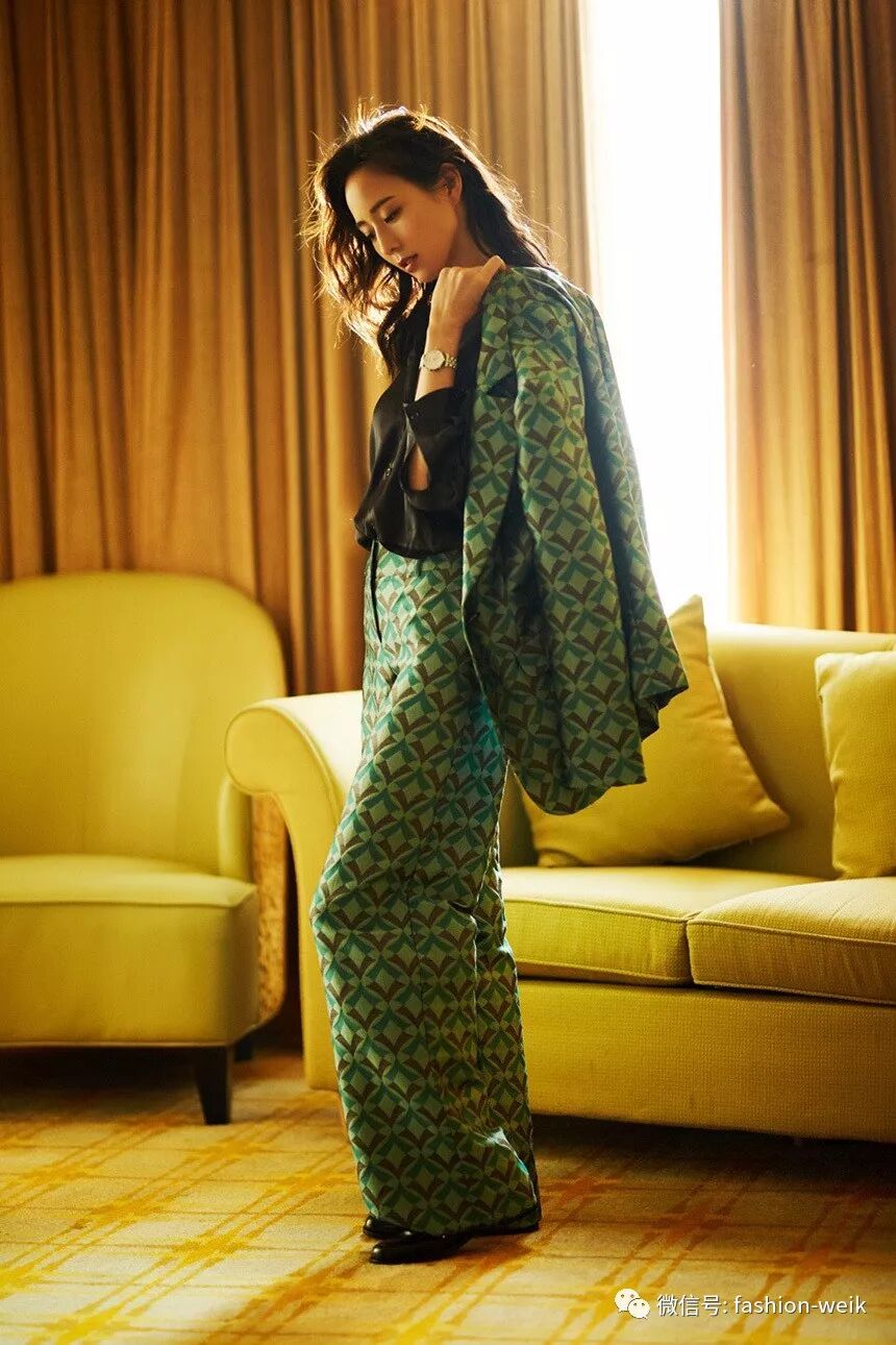 黑色的衬衫,搭配上绿色的格子宽松直筒裤,外搭同款外套,沉稳之中又带着几分的抢眼与个性。