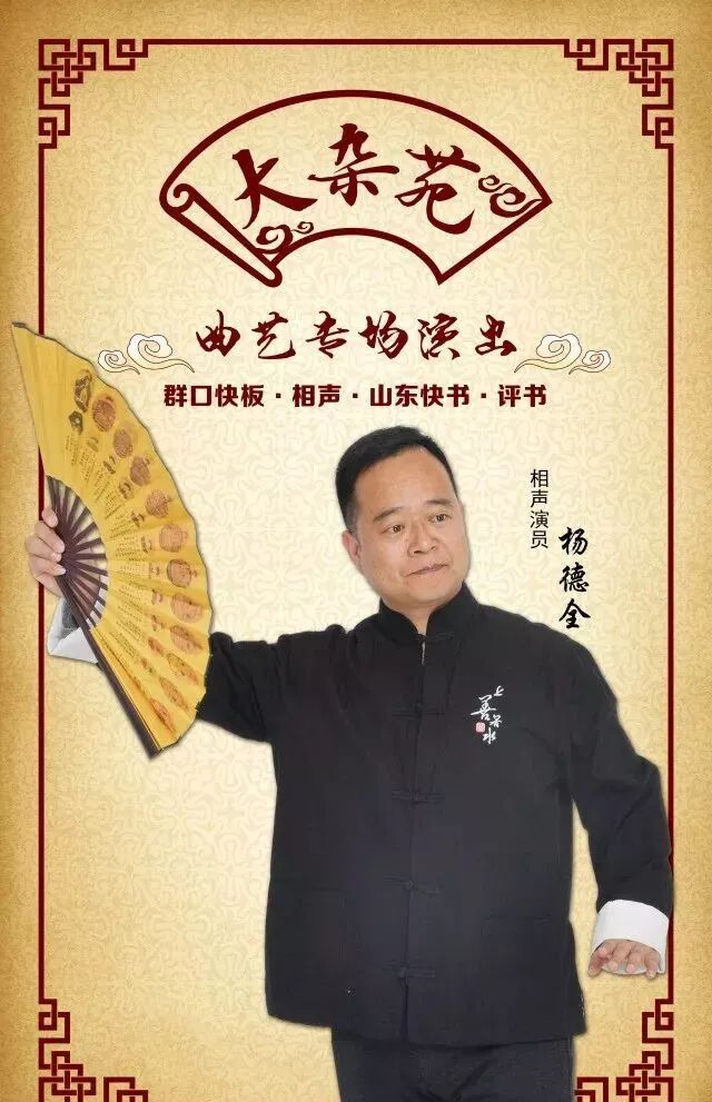 杨德全,辽宁省曲艺家协会会员、大连市曲艺家协会会员、中国快板艺术委员会大连分会理事;评书、快板演员。师承于快板、相声表演艺术家石浩先生;评书表演得益于师奶刘兰芳亲传。曾荣获:大连电视台《欢乐家年华》大赛亚军、大冷集团艺术节《冰山好声音》大赛冠军。常表演的评书有《岳云锤震金蝉子》、《康熙买马》、《莾撞人》;快板《五数同仁堂》《句句黑》《武松打虎》等。