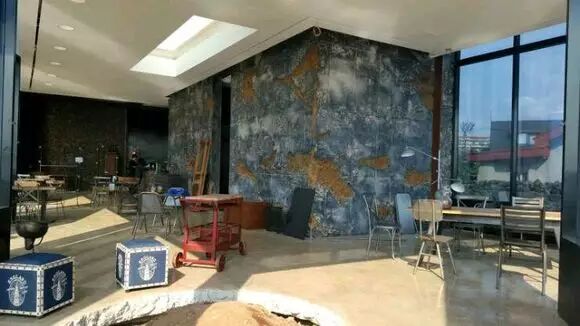 GD的品味一向独特。这次咖啡馆内部装饰是带点破旧感的工业风。破碎的墙壁搭配木质的桌椅和金属类装饰物,时髦又现代!