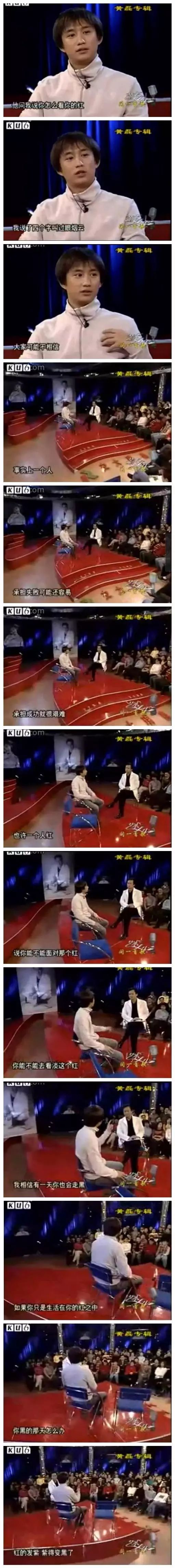 别人曾问过他,对于自己红了,他说:过眼烟云,大家可能不相信,事实上一个人,承受失败还容易,承受成功很艰难,也许一个人红,说你能不能面对这个红,看淡这个红,我相信有一天你也会走黑,如果你只生活在你红中,你黑那天怎么办?