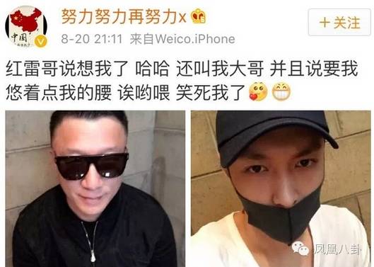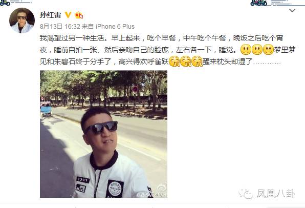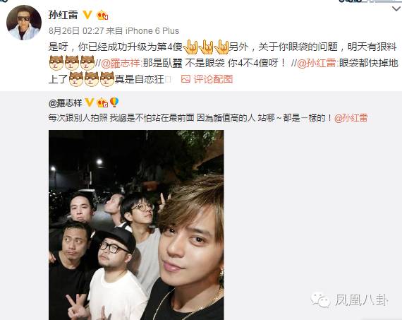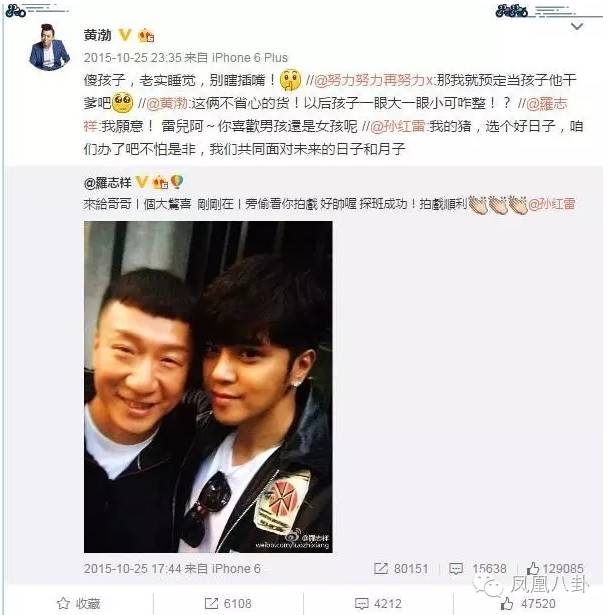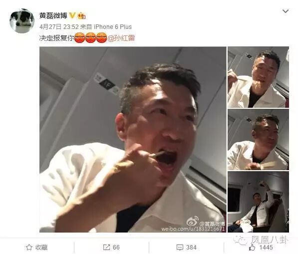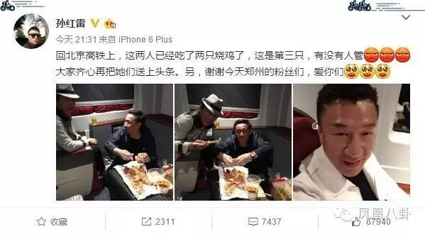 几个人在微博上也有很多互动~比如有一次心机boy孙红雷PO出黄磊和黄渤在高铁上吃烧鸡的照片嘲笑他们的吃相,并附上自己的美美自拍作对比