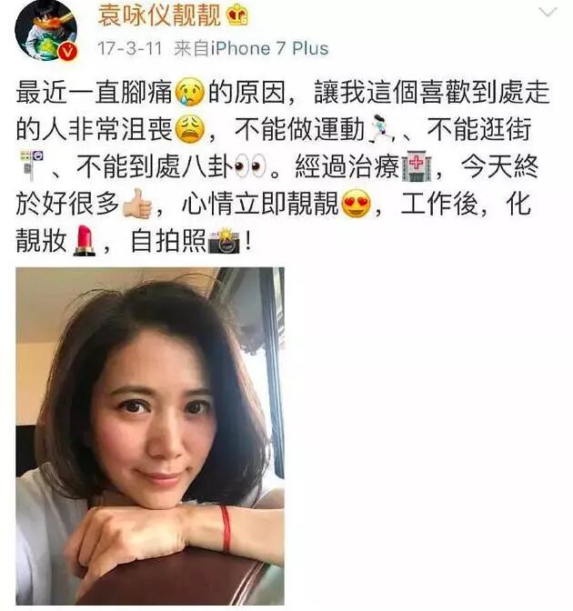 同样的还有袁咏仪,脚痛治好后心情变好,难得发一张自拍。