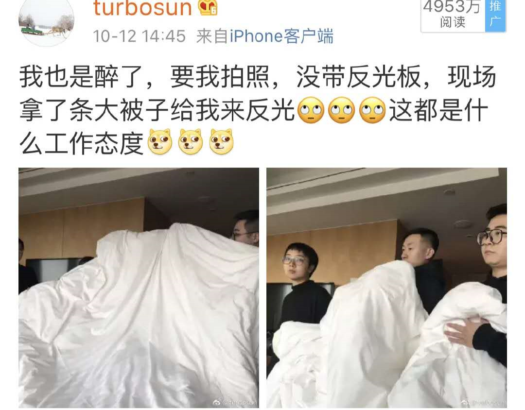 孙俪之前拍广告,工作人员忘记带反光板,白色被子就被临时拿来充当反光板。