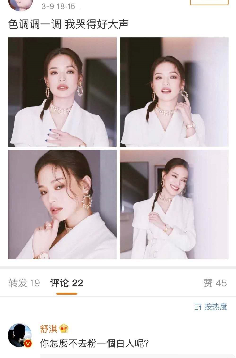 舒淇看到后直接在评论里留言,让粉丝去粉白人。