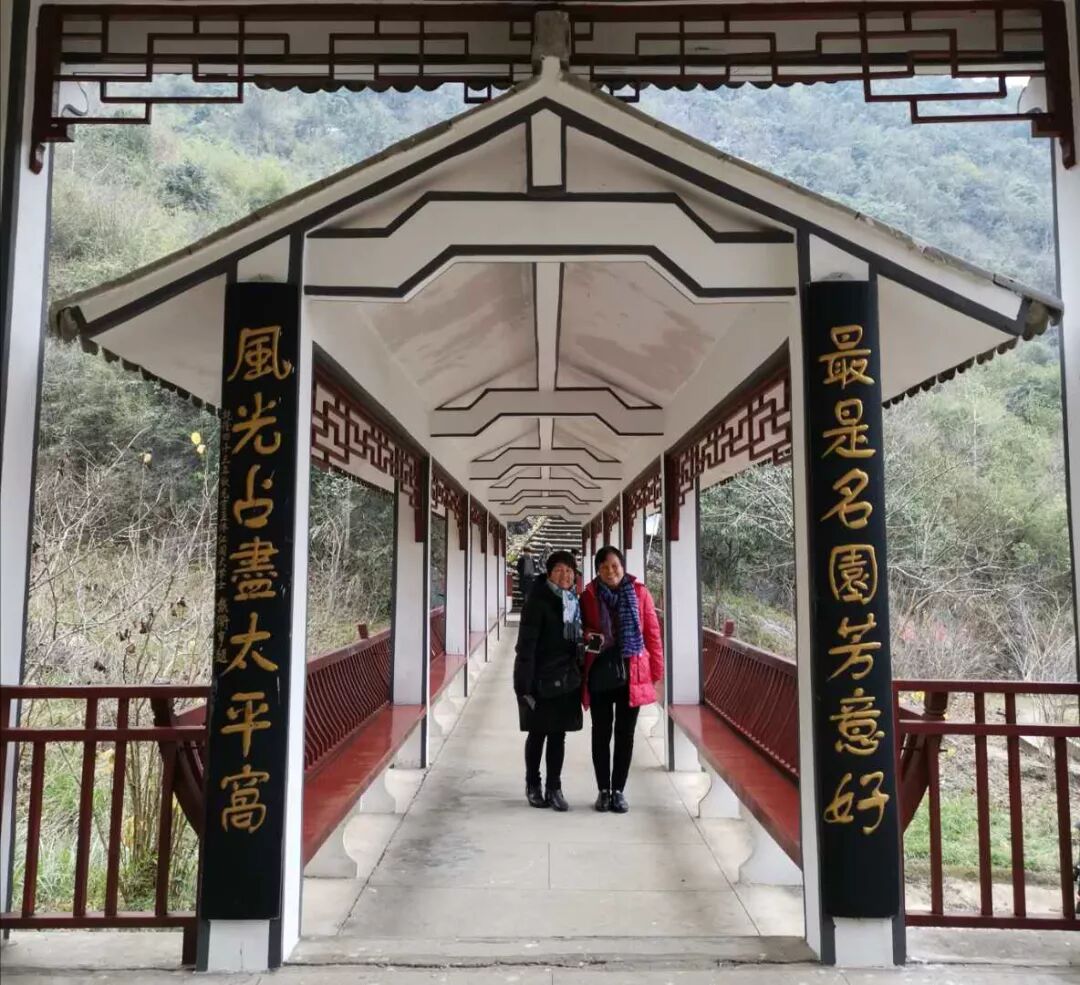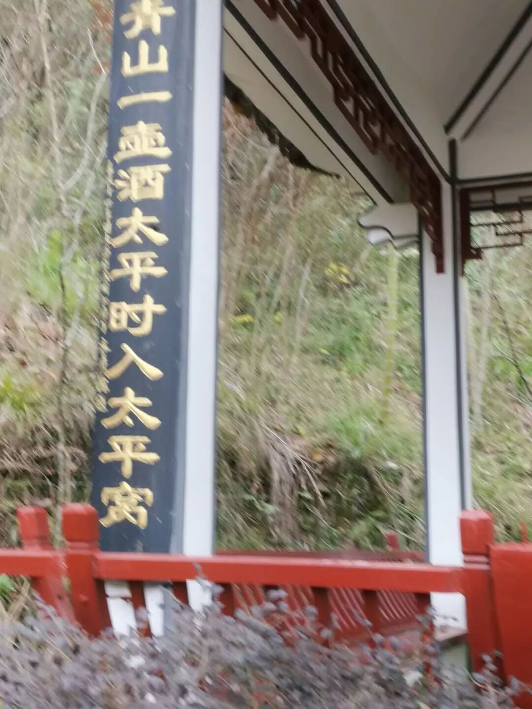 沿着台阶拾级而上,便是一座洙红色的景观桥,桥头木柱上展现着”尊重青山一壶酒 太平时入太平窝”的古人佳联。