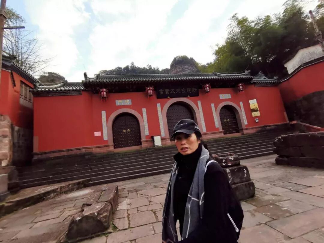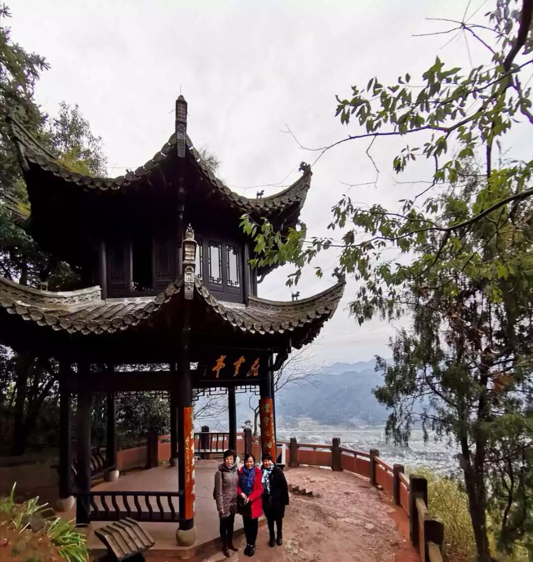 齐云山的亭台有16座,三位美女在索道顶的“龙云亭”合影。