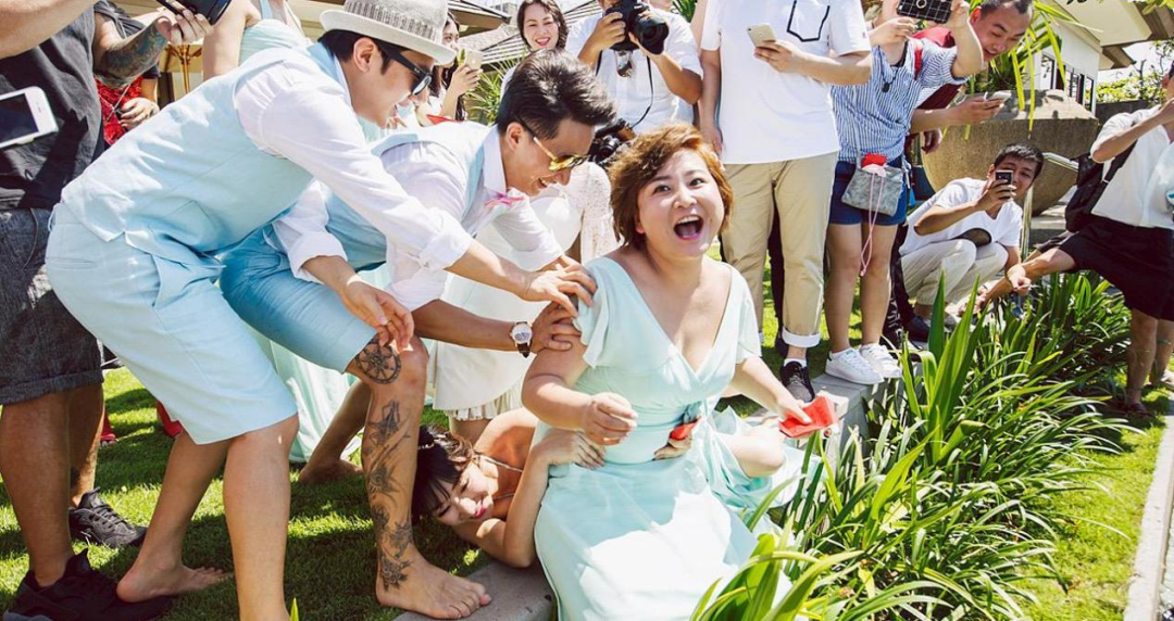 当然更经典的,还有包贝尔婚礼上的「伴娘门」事件,被一众男明星闹着要推搡进泳池的柳岩,瑟缩在贾玲身后。