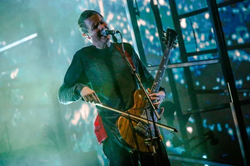 Jonsi 拿着大提琴的琴弓拉吉他,别有一番韵味。