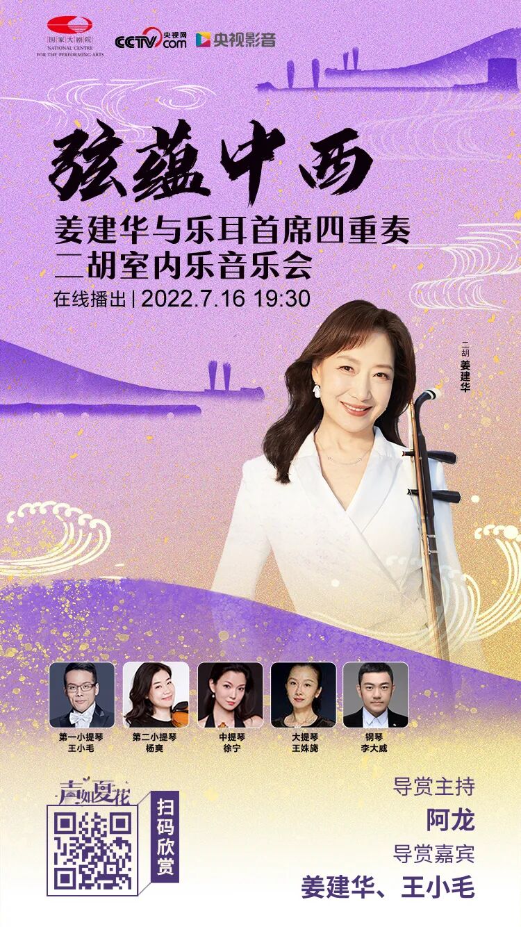 怀揣恪守匠心的情怀钩沉古今,民族乐器二胡将与西方弦乐四重奏邂逅相遇。二胡演奏家姜建华再度奏响令指挥家小泽征尔潸然的《二泉映月》,赋予曲目返朴归真的灵魂质感。日本作曲家加古隆创作的《大河的一滴》、《弦歌幻想》,运用刻画入微的二胡,实现两首东方美学作品从冥思到向心的深度探索。