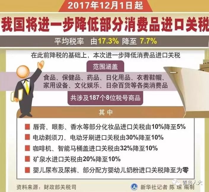 财政部近日发布消息,从12月1日起,我国将进一步降低部分消费品进口关税,平均税率由17.3%降至7.7%。