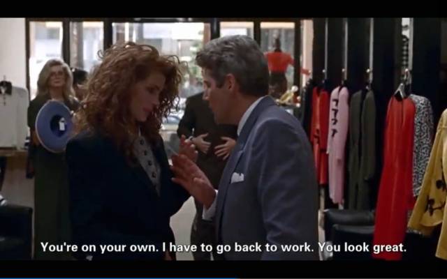Edward把信用卡给了Vivian并对她说,You're on your own. I have to go back to work. 我要回去工作了,你要自己买买买啦。
