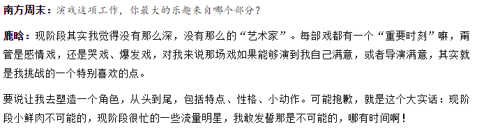 现阶段其实我觉得没有那么深,没有那么的“艺术家”……要说让我去塑造一个角色,从头到尾,包括特点、性格、小动作。可能抱歉,就是这个大实话:现阶段小鲜肉不可能的,现阶段很忙的一些流量明星,我敢发誓那是不可能的,哪有时间啊!