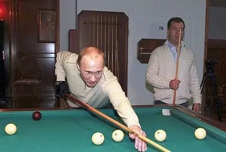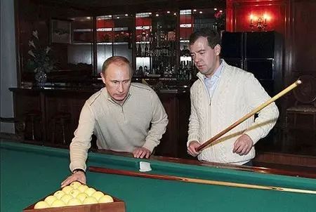 普京和梅德韦杰夫切磋台球。