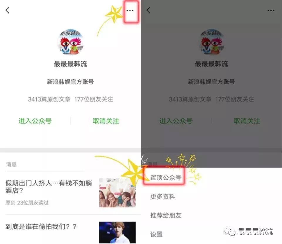 因为微信再次改版…为了避免【最最最韩流】消失在大家订阅号的信息流里,这里柚哥给大家做了个“星标最韩流”的教程。