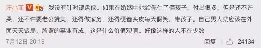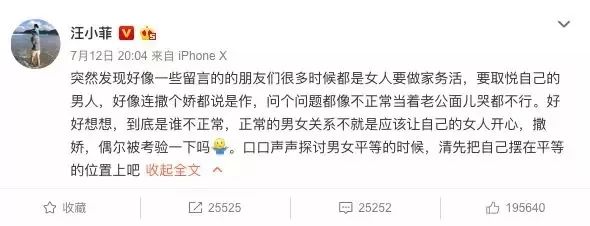 “突然发现好像一些留言的朋友们很多时候都是女人要做家务活,要取悦自己的男人,好像连撒个娇都说是作,问个问题都不像正常当着老公面儿哭都不行。好好想想,到底是谁不正常,正常的男女关系不就是应该让自己的女人开心,撒娇,偶尔被考验一下吗?口口声声探讨男女平等的时候,请先把自己摆在平等的位置上吧。”