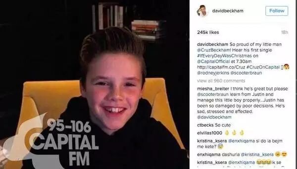 ▲贝克汉姆的小儿子克鲁兹(Cruz Beckham) 今年11岁,年纪轻轻的他在唱歌方面颇有天赋,近日他推出了个人单曲“如果每一天都是圣诞节” (If Everyday Was Christmas”, 这首歌就在Capital FM电台上首播。克鲁兹在自己的推特账号上表示歌曲的收入将会捐献给一个叫“Global’s Make Some Noise”的慈善机构