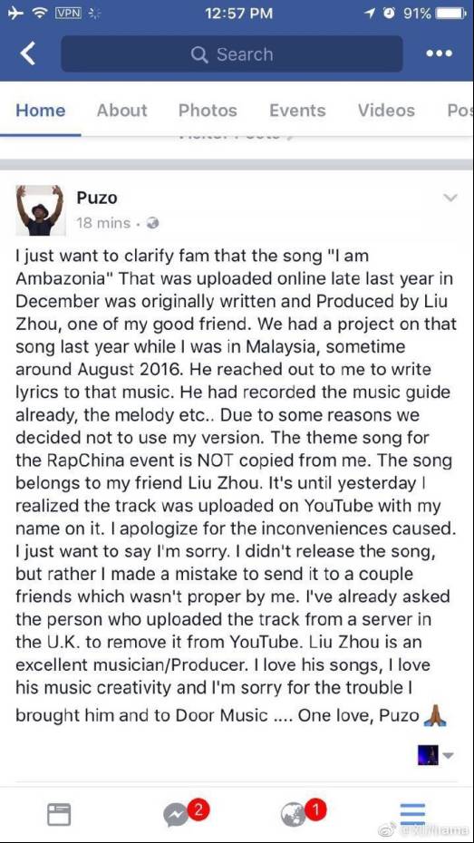据国内HipHop音乐制作人Sdound透露,该曲是刘洲于2016年创作,最初,刘洲邀请喀麦隆歌手在国外进行试录,没料到该歌手却用Demo制作了自己的歌曲并公开发布,事后该歌手在其facebook及朋友圈发表道歉文,表示擅自使用音乐作品的行为,对刘洲老师本人和节目所造成的不良影响深表歉意,并表示非常喜欢刘洲老师的音乐。随后刘洲发博陈述了整个事件的前因后果,同时感慨:“我们何时变得如此自卑的?中国人只配抄袭是吧?”。