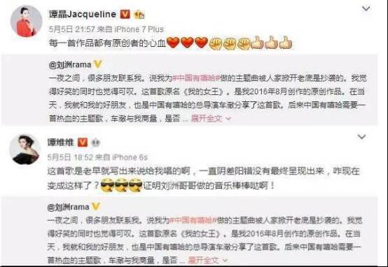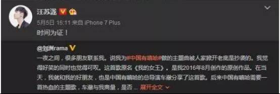 值得一提的是,许多明星大咖也纷纷力挺刘洲,包括谭晶、谭维维、汪苏泷等音乐人在内,都通过其微博公开发声,希望大家能够尊重制作人的原创心血,据谭维维爆料,此曲最初本要给她唱的,因为阴差阳错才一直未能成型,这也充分验证了原创事实,更表达了创作者们希望媒体不要跟风扩散不实信息的强烈愿望。