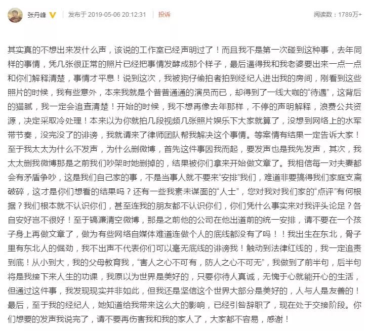 看得出来,张丹峰本意是要平息风波,但这篇自黑级别的声明一出,却招致了更大的舆论反弹。网友几乎一边倒地指责他狡辩和推卸责任,而且对另一半毫无歉意。