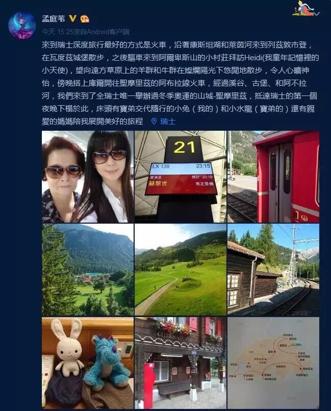 今日,美美的月亮女神孟庭苇于微博晒出旅游的美图原来亚亚姐趁着难得的假期到瑞士旅游了呢!女神说『瑞士深度旅游最好的方式就是坐火车啰,沿途经过许多美丽的景点,康斯坦湖、莱茵河、列兹敦市登...这么多美丽的景点让女神感到心旷神怡,心情也感到悠闲放松,亚亚姐抵达瑞士的第一个夜晚下榻于全瑞士唯一举办过冬季奥运的山城-圣摩利兹,床头摆放着宝弟交代随行的小兔(我的)和小水龙(宝弟的)还有亲爱的妈妈陪我展开美好的旅程』