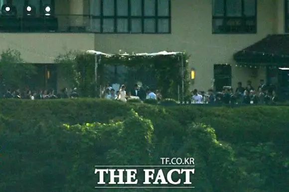 △韩媒拍到的朦胧的现场照。婚礼将仅邀请双方家人及好友参加,采取非公开形式进行。据知情人士透露,二人婚礼祝歌将由超豪华明星阵容担任,平素与裴勇俊交情甚深、被称为韩国“歌王”的郑淳元(The One),知名R&B组合4Men成员申容财,以及裴勇俊的至交、JYP娱乐代表朴振荣将为新人献上祝福歌曲。