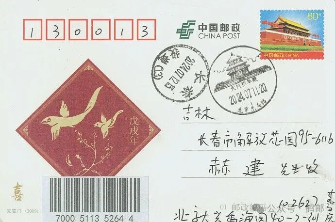 戳片平邮寄自北京顺义,“天坛祈年殿2024.07.11.20.北京东安路”风景日戳销资并收寄,应该旁盖营业邮政日戳表明收寄。日戳中日期字钉装颠倒了,好在识别的都是“11”。不会搞错,哈。